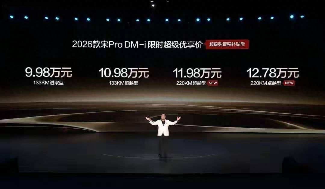 凭借稳定的技术表现和均衡的产品力,始终占据着主体地位。近日,这款热门车型迎来重要升级——2026款宋Pro DM-i长续航版正式上市,以12.28万-13.08万元的指导价和限时9.98万-12.78万元的超级优享价(含购置税补贴),为广大购买的人带来更具吸引力的选择。新车最大亮点在于CLTC工况下纯电续航能力提升至220公里,较此前133公里的版本实现显著突破。